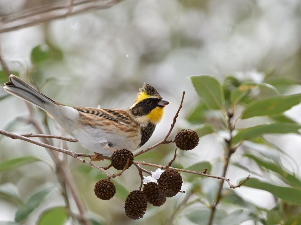 雪が地面を覆う森の中を散策中にホオジロの声。上を見上げるとミヤマホオジロがヤシャブシの実をついばんでいました。