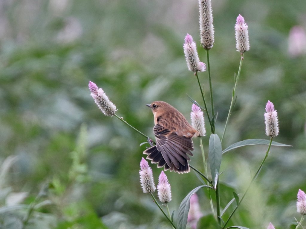 ■コメント:ノビタキがノゲイトウに止まって、飛んでくる虫をフライングキャッチしています。面白いので暫く見学していましたが、突然羽を広げてノビをしてくれました。のどかな風景、いつまでもこのまま続いてほしいものです。