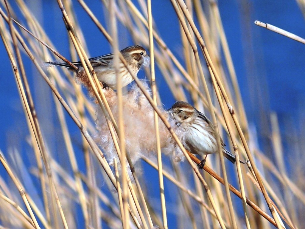 ■コメント:葦原に群れでいました。画像を拡大すると嘴に、カイガラムシかその殻と思われる白い塊がついています。珍しく絵になるところにとまってくれました☆