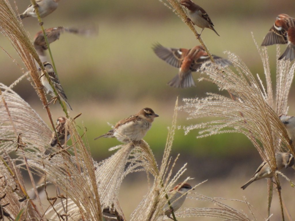 ■コメント:50羽以上の群れを見つけました。田んぼに降りて餌を探していました。ふと、何かに驚いてススキに隠れている瞬間です。