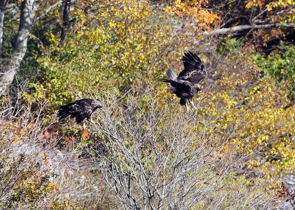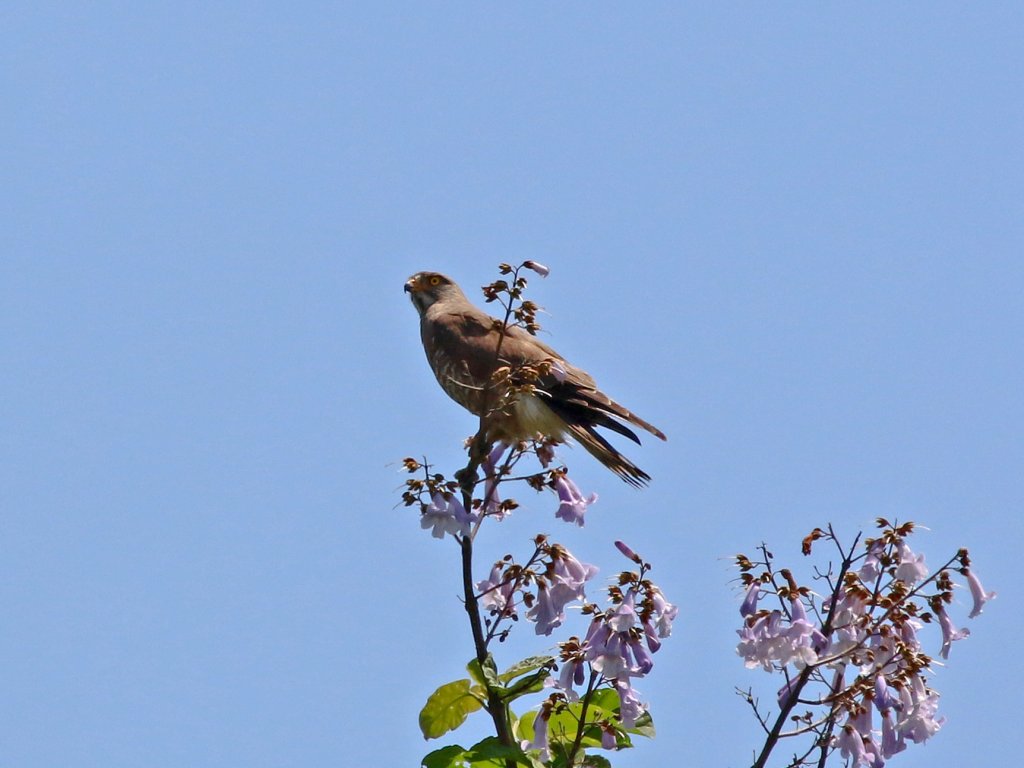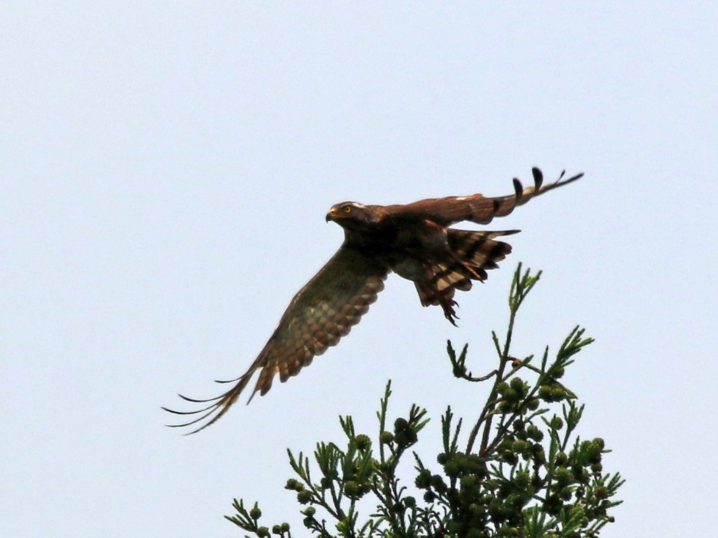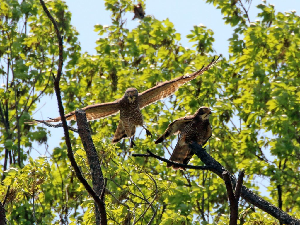 ■コメント:この時期、ムギマキを探してカラスザンショウの近くでいたところ、大きな影が・・。 クマタカとハイタカのツーショット。 ハイタカの方がはるかに俊敏でした。